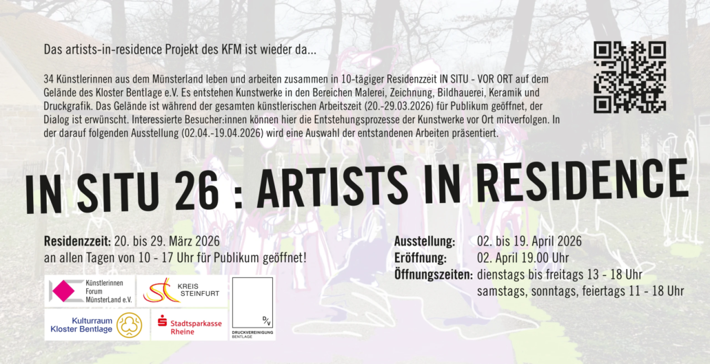 30 Künstlerinnen quartieren sich für zehn Tage im Kloster Bentlage ein und verwandeln das historische Gelände erneut zu einem offenen Atelier. IN SITU, das Residenz- und Ausstellungsformat des KFM, lädt Besucherinnen und Besucher ein, künstlerische Prozesse unmittelbar mitzuerleben – und macht kreative Arbeit sichtbar und erfahrbar.